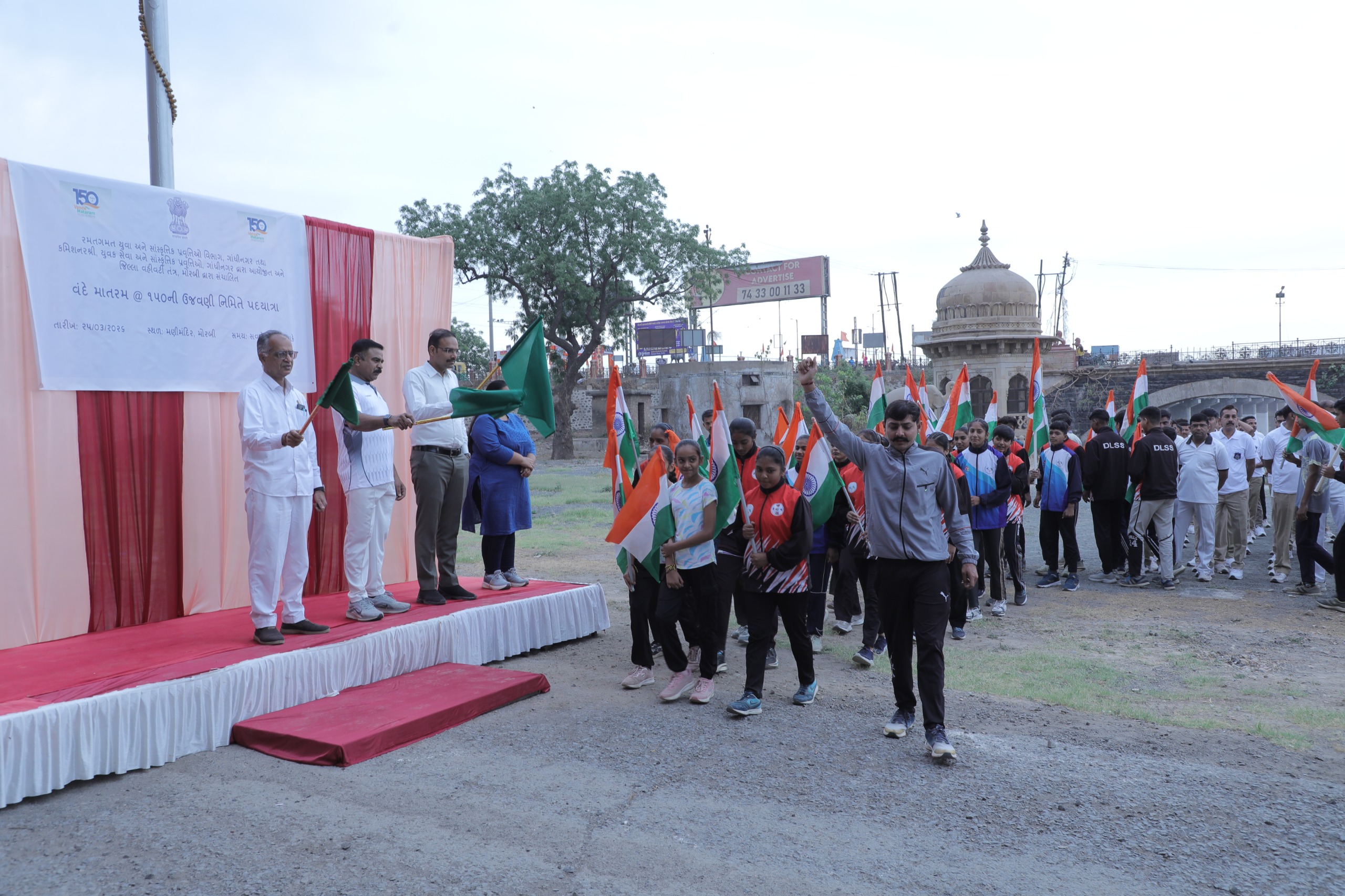 વંદે માતરમ્ @ ૧૫૦’ ના આ દ્વિતીય તબક્કાની ઉજવણી દ્વારા મોરબી જિલ્લામાં દેશપ્રેમ અને રાષ્ટ્રીય ગૌરવની લાગણી સાથે વિવિધ કાર્યક્રમો યોજાઈ રહ્યા છે, જેના ભાગરૂપે આયોજિત આ વિકાસ પદયાત્રાને મહાનુભાવોએ મણીમંદિર ખાતેથી પ્રસ્થાન કરાવી હતી. દેશભક્તિના સૂત્રોચ્ચાર સાથે શિસ્તબદ્ધ રીતે આ પદયાત્રા શહેરના મુખ્ય માર્ગ પરથી પસાર થઈ ત્રિકોણબાગ ખાતે પહોંચી હતી. જ્યાં મહાત્મા ગાંધીજીના સ્ટેચ્યુ ખાતે ભાવવંદના સાથે પદયાત્રાની પૂર્ણાહુતિ કરવામાં આવી હતી. યાત્રાની પૂર્ણાહુતિ પ્રસંગે મહાનુભાવો દ્વારા વિદ્યાર્થીઓને વંદે માતરમની ઐતિહાસિક પૃષ્ઠભૂમિ અને ભારતના સંવિધાન અને સંસ્કૃતિમાં તેના મહત્વ વિશે માહિતગાર કરવામાં આવ્યા હતા.