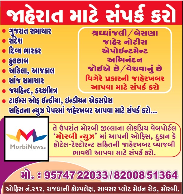 સંસ્કૃતિય આર્ય ગુરુકુલમ રાજકોટના સહયોગથી તા. 01-03-2026 ને રવિવારે સવારે 9 થી બપોરે 1 સુધી વિશ્વકર્મા સોસાયટી, નીલકંઠ સ્કૂલ સામે, રવાપર રોડ મોરબી ખાતે નિશુલ્ક સુવર્ણપ્રાશન ટીપા પીવડાવવાનો કેમ્પ યોજાશે