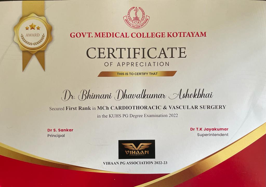 મૂળ મોરબીના ખાનપર ગામના વતની ભીમાણી ધવલ અશોકભાઈ એમબીબીએસ, એમએસનો અભ્યાસ કરીને ઉચ્ચ તબીબી કોર્સ માટે કેરળના કોટ્ટયમની સરકારી મેડિકલ કોલેજમાં અભ્યાસ કરતા હતા. જેમાં તેઓએ અથાક મહેનત કરીને સુપરસ્પેશિયાલિટી એમસીએચ કાર્ડિયોવેસ્ક્યુલર અને થોરાસિક સર્જરીમાં કેરળ યુનિવર્સિટી ઓફ હેલ્થ સાયન્સમાં પ્રથમ નબર મેળવ્યો છે.