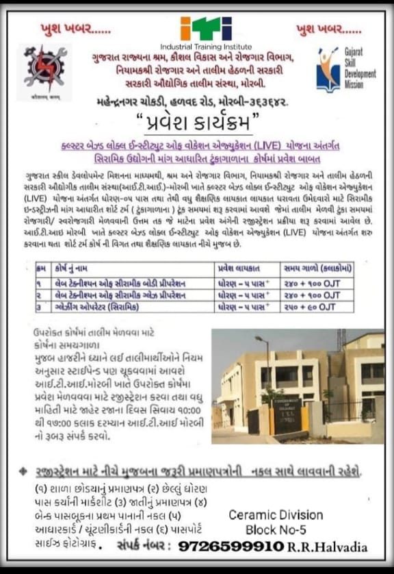 ગુજરાત સ્કીલ ડેવલોપમેન્ટ મિશનના માધ્યમથી શ્રમ અને રોજગાર વિભાગ, નિયામક રોજગાર અને તાલીમ હેઠળની સરકારી ઓદ્યોગિક તાલીમ સંસ્થા (ITI) મોરબી ખાતે ક્લસ્ટર બેઝ્ડ ઇન્સ્ટીટ્યુટ ઓફ વોકેશન એજ્યુકેશન યોજના અંતર્ગત ધોરણ ૫ પાસ તથા તેથી વધુ શૈક્ષણિક લાયકાત ધરાવતા ઉમેદવારો માટે સિરામિક ઇન્ડસ્ટ્રીઝની માંગ આધારિત શોર્ટ ટર્મ (ટૂંકાગાળા) ટૂંક સમયમાં શરુ કરવામાં આવશે જેમાં તાલીમ મેળવી ટૂંકા સમયમાં રોજગારી/સ્વ રોજગારી મેળવવાની તક માટેના પ્રવેશ અંગેની રજીસ્ટ્રેશન પ્રક્રિયા શરુ કરવામાં આવી છે