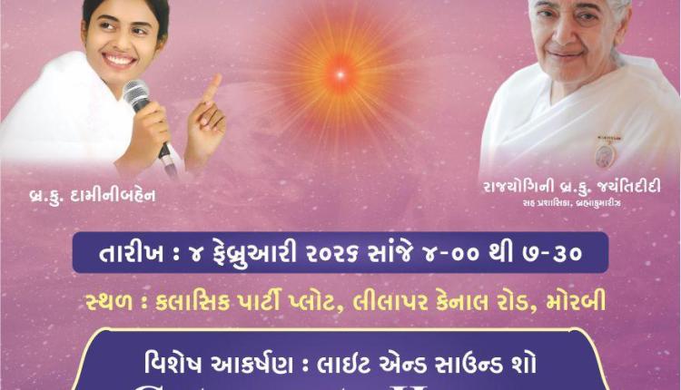 મોરબીના આંગણે આગામી 4 ફેબ્રુઆરી, 2026 ના રોજ એક ઐતિહાસિક આધ્યાત્મિક મહોત્સવ યોજાવા જઈ રહ્યો છે. આ કાર્યક્રમમાં વિશ્વવિખ્યાત વક્તા અને બ્રહ્માકુમારીઝ સંસ્થાના એડિશનલ ચીફ (સહ-પ્રશાસિકા) આદરણીય બી.કે. જયંતી દીદીજી (લંડન) પ્રથમવાર મોરબી પધારી રહ્યા છે અને તેમના દ્વારા જીવન પરિવર્તનકારી ઉદ્બોધન આપવામાં આવશે.