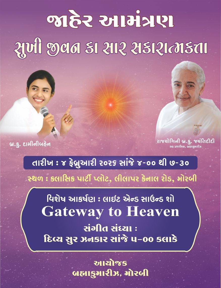 મુખ્ય પ્રવચન – બી.કે. જયંતી દીદીજી: કાર્યક્રમનું મુખ્ય આકર્ષણ દીદીજીનું પ્રવચન રહેશે. તેઓ “સુખ જીવનનો સાર: સકારાત્મકતા” વિષય પર ઊંડાણપૂર્વક માર્ગદર્શન આપશે, જેમાં તણાવમુક્ત અને સુખી જીવન જીવવાની ચાવીઓ સમજાવવામાં આવશે.