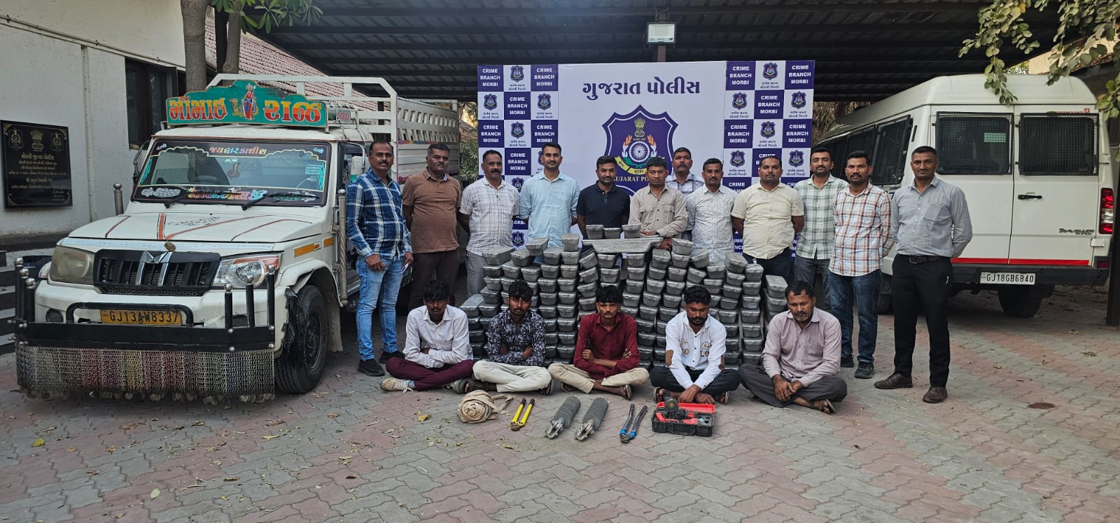 વાંકાનેર તાલુકા પોલીસે ફરિયાદ નોંધી તપાસ ચલાવી હતી જે તપાસમાં એલસીબી ટીમ પણ જોડાઈ હતી વાંકાનેર વિસ્તારના જુના લોખંડ-પ્લાસ્ટિકના ભંગાર લે વેચ કરતા ભંગારના ડેલાઓ ચેક કરવા સહિતની કામગીરી કરી હતી જેમાં વાંકાનેરના પંચાસર ચોકડી નજીક ઇન્ડિયન પ્લાસ્ટિક નામના ભંગારના ડેલામાં ચેકિંગ દરમિયાન ચોરીનો મુદામાલ મળી આવ્યો હતો જેથી આરોપી કુકાભાઈ ઉર્ફે કુકો મનજીભાઈ ડાભી રહે વિનયગઢ તા. વાંકાનેર, શૈલેષ રમેશ ગણાદીયા અને કરણ ઉર્ફે સંજય રાજાભાઈ ગણાદીયા રહે બંને સતાપર વાંકાનેર અને ભૂરા માલાભાઈ સરૈયા રહે હીરાણા તા. થાનગઢ તેમજ ચોરીનો મુદામાલ રાખનાર હુશેન વલીમાંમદ કાસમાણી રહે ચંદ્રપુર તા. વાંકાનેર એમ પાંચને ઝડપી લીધા છે