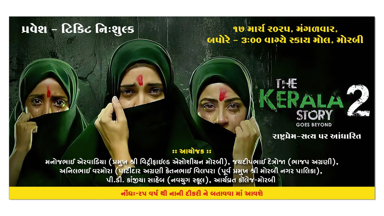 મોરબી માં કેરાલા સ્ટોરી-2 ની શુલ્ક દીકરી ઓ ને ઉદ્યોગપતિઓ અને સામાજિક અને રાજકીય આગેવાનો દ્વારા મુવી દેખાડવાનું આયોજન કરવામાં આવ્યું છે મોરબી સિરામિક એસો પ્રમુખ મનોજભાઈ એરવાડિયા, ભાજપ અગ્રણી જયદીપભાઈ દેત્રોજા, પાટીદાર સમાજ અગ્રણી અનિલભાઈ વરમોરા, પૂર્વ નગરપાલિકા પ્રમુખ કેતનભાઈ વિલપરા, નવયુગ સંકુલના પ્રમુખ પી ડી કાંજીયા, તેમજ આર્યવ્રત કોલેજ મોરબીના આર્થિક સહયોગથી આયોજન કરવામાં આવ્યું છે
