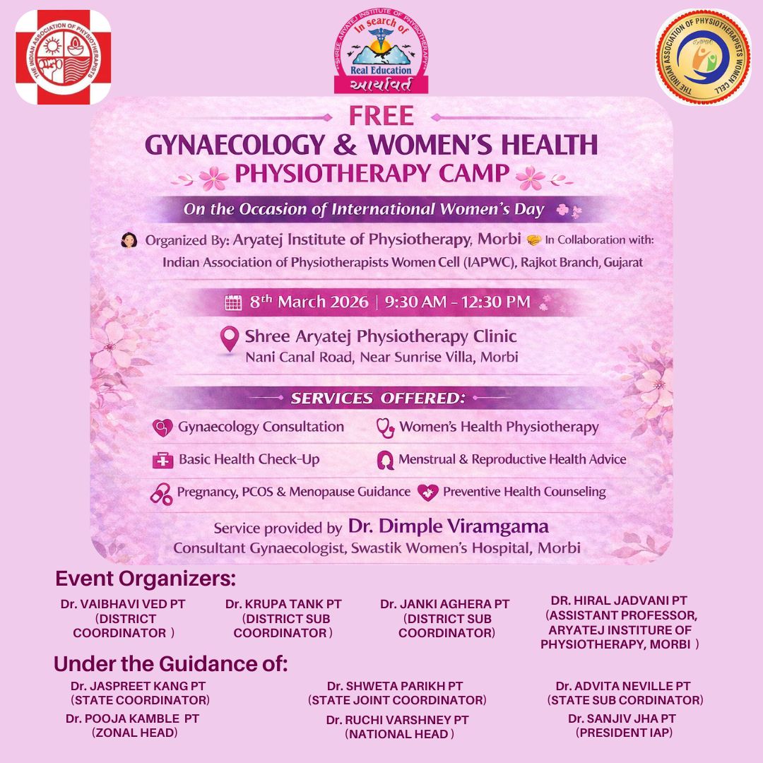 આ કેમ્પ તા. ૮ માર્ચ ૨૦૨૬, રવિવારના રોજ સવારે ૧૦ : ૦૦થી બપોરે ૧૨:૦૦ વાગ્યા સુધી યોજાશે. કેમ્પનું સ્થળ ત્રીજો માળ, નિલકંઠ પ્લાઝા–૨, નાની કેનાલ રોડ, સનરાઇઝ વિલા સોસાયટી પાસે, મોરબી રહેશે. આ આયોજનમાં આર્યતેજ ઇન્સ્ટિટ્યૂટ ઓફ ફિઝીયોથેરાપી, મોરબી તથા ઇન્ડિયન એસોસિએશન ઓફ ફિઝીયોથેરાપીસટ્સ વુમન સેલ (IAPWC), રાજકોટ બ્રાન્ચ, ગુજરાતનો સહયોગ પ્રાપ્ત થયો છે. મોરબી તથા આસપાસની મહિલાઓને આ મફત કેમ્પનો લાભ લેવા માટે આયોજકો દ્વારા વિનંતી કરવામાં આવી છે. વધુ માહિતી અથવા એપોઇન્ટમેન્ટ માટે મો. ૯૫૧૨૪૧૦૦૯૯ પર સંપર્ક કરી શકાય છે.