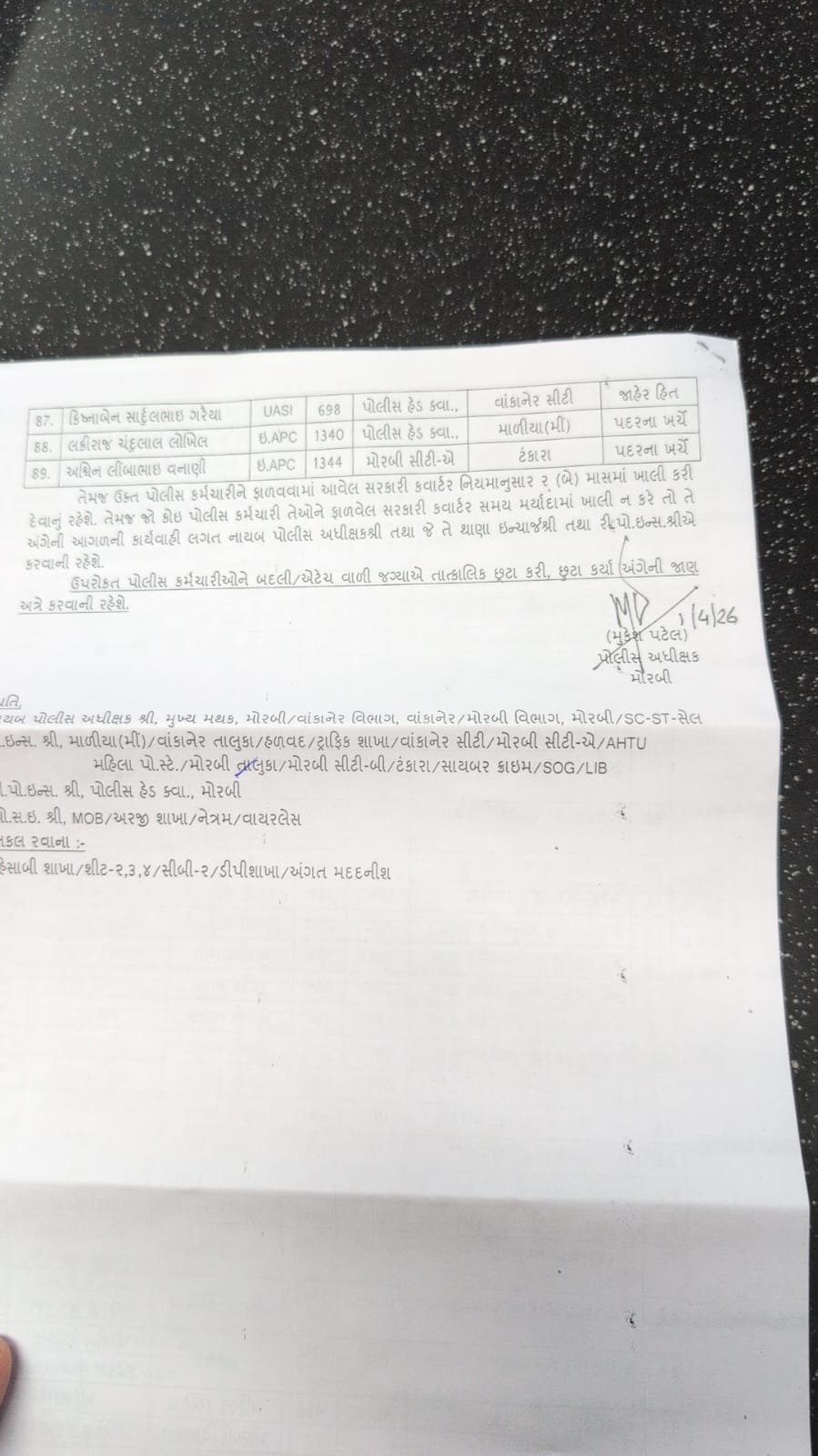 મોરબી જીલ્લા પોલીસવડા મુકેશ પટેલ દ્વારા મોરબી જીલ્લાના મોરબી, માળિયા, હળવદ, ટંકારા અને માળિયા પોલીસ મથકમાં ફરજ બજાવતા પોલીસકર્મીઓની બદલી કરવામાં આવી છે કોન્સ્ટેબલ, હેડ કોન્સ્ટેબલ અને એએસઆઈની બદલી કરવામાં આવી છે
