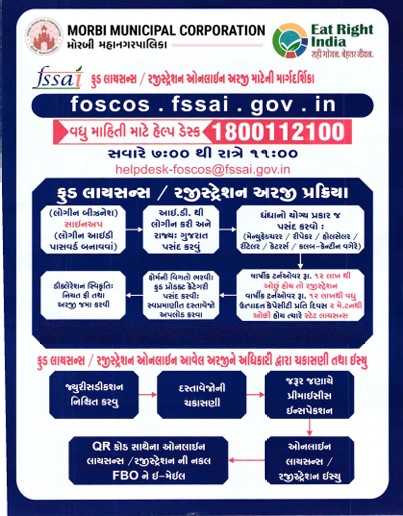 મોરબી મહાનગરપાલિકાની ફૂડ શાખા દ્વારા શહેરના ખાણી–પીણીના ધંધાર્થી ઓને જણાવવાનું કે નવા ફૂડ લાઇસસન્સ અને રજીસ્ટ્રેશન ઘેર બેઠા ઓનલાઈન કરી શકાય છે, ફૂડ લાયસન્સ મેળવવા માટેની માર્ગદર્શિકા જાહેર કરવામાં આવી છે, જેના માટે foscos.fssai.gov.in પર લૉગિન કરી મેળવી શકાય છે.