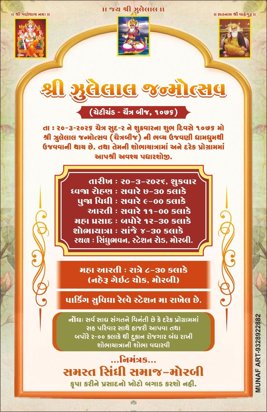 મોરબી સિંધી સમાજ દ્વારા તા. ૨૦ માર્ચ ચૈત્ર સુદ ૨ ને શુક્રવારના શુભ દિવસે ૧૦૭૬ મો શ્રી ઝૂલેલાલ જન્મોત્સવની ભવ્ય ઉજવણી કરવામાં આવશે