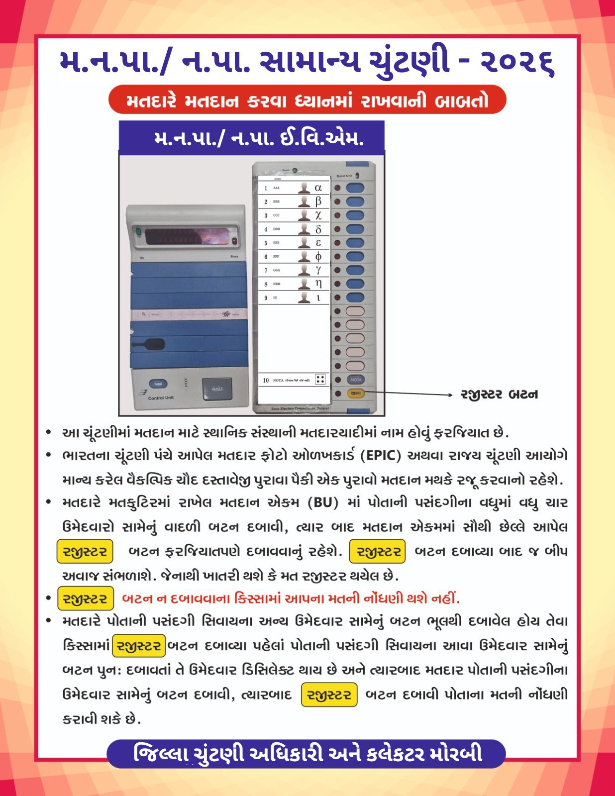 સ્થાનિક સ્વરાજ્યની મહાનગરપાલિકા અને નગરપાલિકાની ચુંટણીઓ આડે એક જ દિવસ બાકી છે ત્યારે મતદાનની પ્રક્રિયા વિષે સમજ મેળવવી જરૂરી છે. ખાસ કરીને જે મતદારો પ્રથમ વખત મતદાન કરી રહ્યા છે અથવા જેમને કોઈ મૂંઝવણ છે એમને આ માહિતી જાણવી અનિવાર્ય છે.