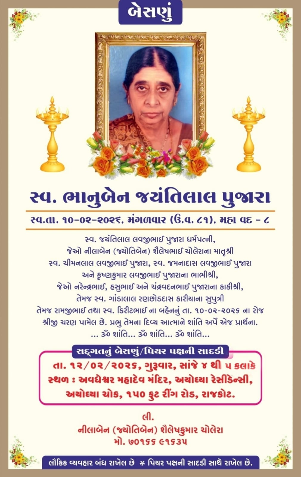 સદગતનું બેસણું તા.12/2/2026 સાંજે 4 થી 5, અવધેશ્વર મહાદેવ મંદિર, અયોધ્યા રેસીડેન્સી, અયોધ્યા ચોક, 150 ફૂટ રીંગ રોડ, રાજકોટ ખાતે રાખેલ છે. (પિયર પક્ષની સાદડી સાથે રાખેલ છે તેમજ લૌકિક વ્યવહાર બંધ રાખેલ છે.)