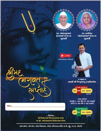 ઘુંટુ ગામે સ્વ. ઓધવજીભાઈ જીવાભાઈ પરેચા અને સ્વ. છબીબેન ઓધવજીભાઈ પરેચાના પુણ્યાર્થે શ્રીમદ ભાગવત સપ્તાહનું આયોજન કરવામાં આવ્યું છે જેમાં શાસ્ત્રી શ્રી વિષ્ણુબાપુ દાણીધારીયા દ્વારા શ્રી મદ ભાગવત સપ્તાહનું રસપાન તા. 02-04-2026 થી 08-04-2026 સુધી કરાવવામાં આવશે.